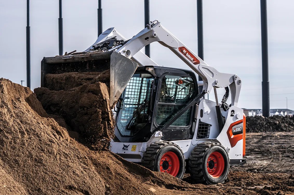 The Bobcat S590 gives you the right numbers up front so you can move more in less time. It delivers a ROC of 2,100 lb for confident pallet and material handling, a Hi-Flow auxiliary hydraulic flow of 26.7 gpm for strong attachment performance, and a 119 in hinge-pin height that reaches common truck beds and hoppers. Pair it with buckets, forks, grapples, or brooms to tackle construction and landscaping jobs with quick cycle times and easy transport between sites. No job is too much - whatever the industry or whatever the task, trust Bobcat S590 to get the job done.