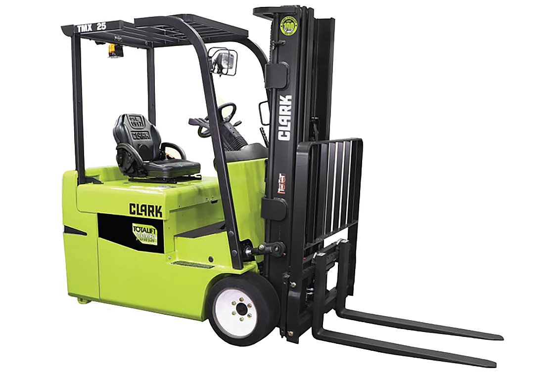 The CLARK TMX 25 is a three-wheel, sit-down electric cushion forklift built for tight indoor aisles, trailers, and dock work. It runs on a 36 or 48-V, 100% AC system for smooth, low-maintenance performance, and carries 5.000 lb at a 24 in load centre. Common mast choices cover everyday racking: 2-stage options around 121–143 in for low-reach work, or a 3-stage up to 188 in when you need higher placement without sacrificing maneuverability.